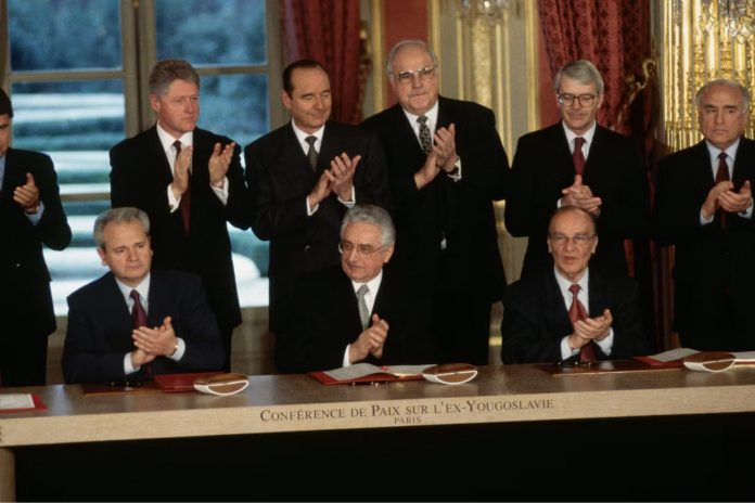 në sallën e konferencave të hotel ”Hope”, në bazën ajrore ”Wright-Patterson”, në Dayton të Ohajos, udhëheqësit e Bosnjë dhe Hercegovinës, Serbisë dhe Kroacisë nënshkruan një marrëveshje që i dha fund tre viteve e gjysmë lufte në BH, sipas website https://theconversation.com/.