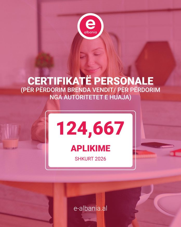 Vetëm gjatë muajit shkurt 2026 përmes portalit e-Albania janë regjistruar 124 667 aplikime për shërbimin “Certifikatë personale (për përdorim brenda vendit / për përdorim nga autoritetet e huaja)”.