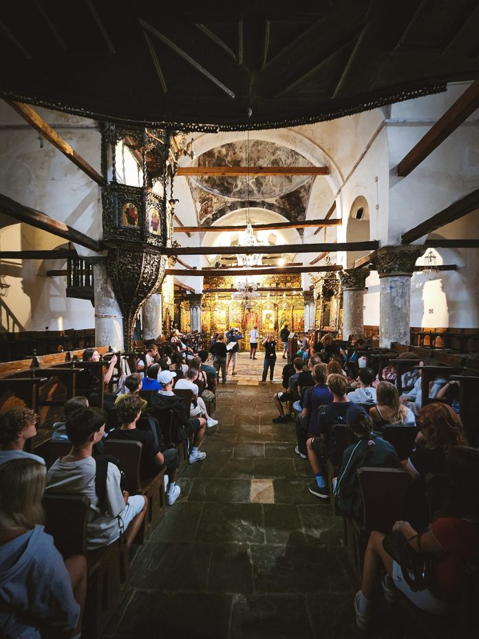 Tek “Onufri” ka një lumë vizitorësh në oborrin e muzeut. Ata janë të kombësive dhe grupmoshave të ndryshme.