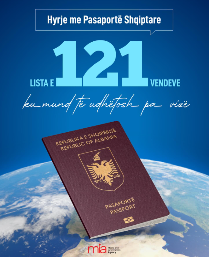 Agjencia për Media dhe Informim bëri të ditur sot se “në vitin 2013, qytetarët shqiptarë udhëtonin pa viza në 88 shtete. Në vitin 2025, kjo shifër ka arritur në 121 destinacione një rritje prej 33 vendeve”.
