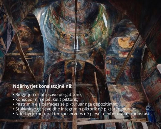 Ndërhyrjet konservuese-restauruese konsistojnë në ringjitjen e shtresave përgatitore, konsolidimin e pelikulit piktorik, pastrimin e sipërfaqes së pikturuar nga depozitimet, stukimin e çarjeve dhe integrimin piktorik në pikturën murale, si dhe ndërhyrje me karakter konservues në pjesët e mbetura të ikonostasit.